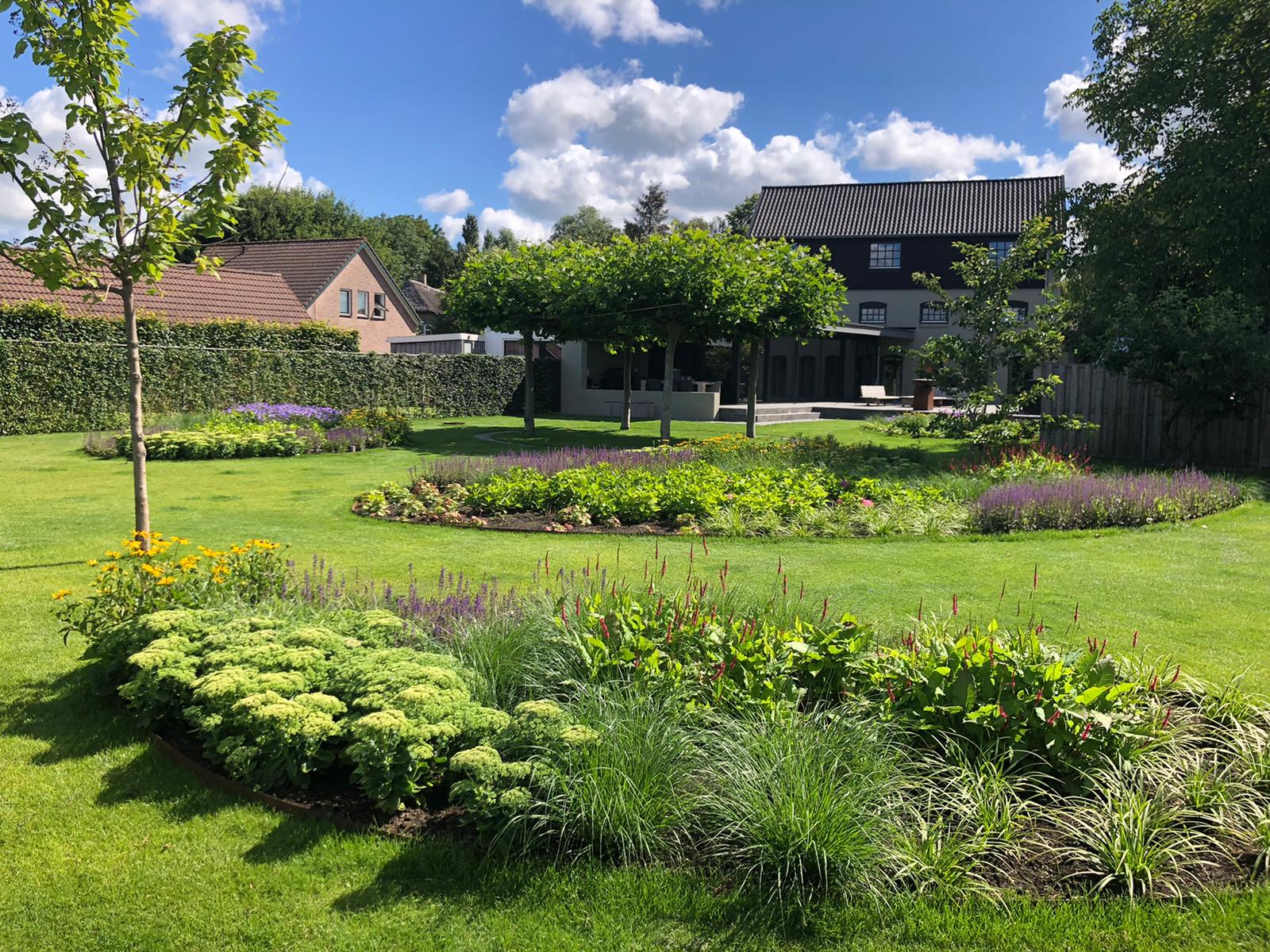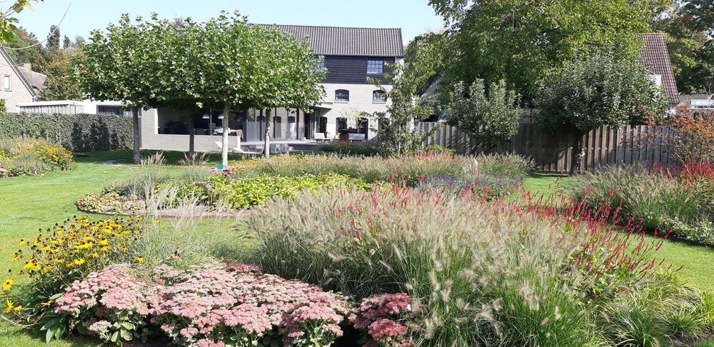 De borders in de vorm van kleurrijke eilanden zijn opgesloten door middel van een corten stalen rand. Siergrassen worden gecombineerd met o.a. Aster divaricus, Persicaria amplexiculis, Geranium ‘Rozanne’, Salvia nemorosa ‘Mainacht’ en Hydrangea macrophylla soorten.