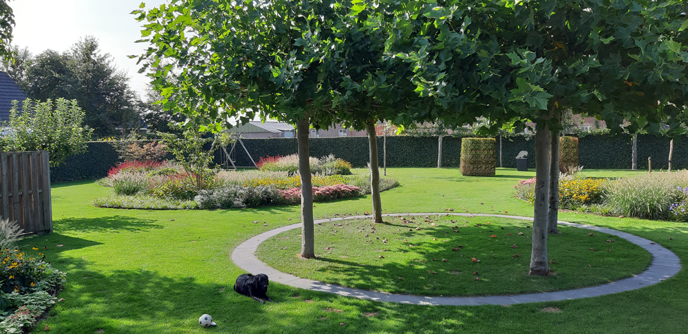 De solitaire bomen, o.a. Nothofagus antarctica, Prunus x Yedoensis, Acer palmatum geven structuur en schaduw aan deze tuin, waarbij de zichtlijn vrijgehouden wordt.